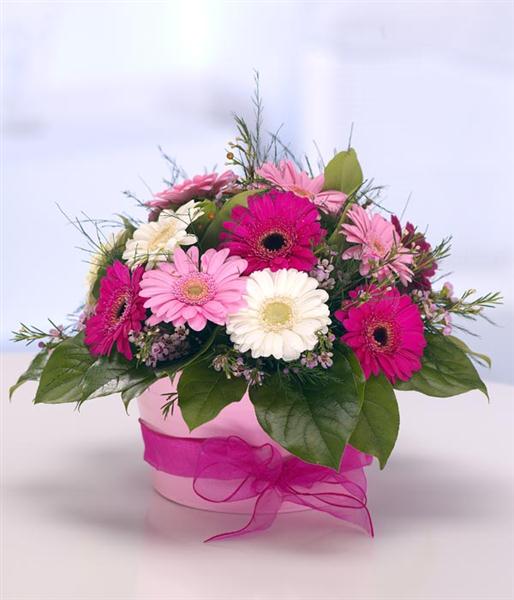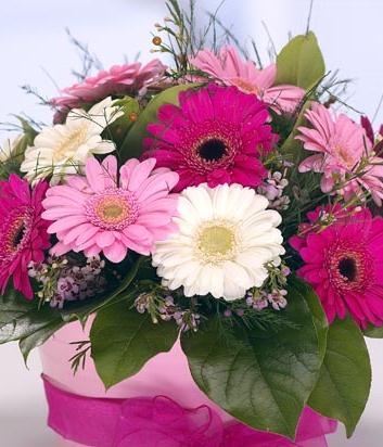 A charming arrangement of pink and white Mini Gerbera in a modern container. Flowers are arranged in floral foam for long lasting freshness and easy display.