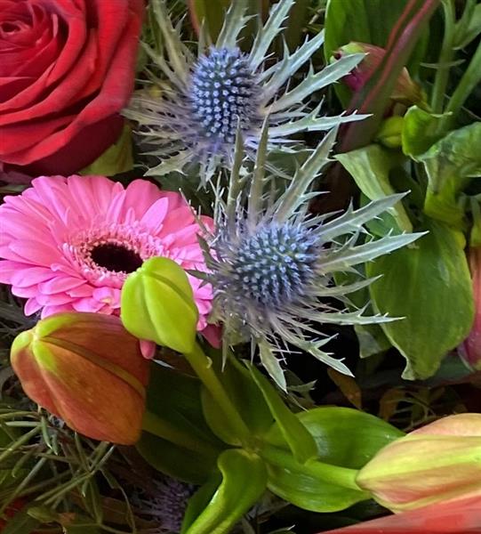 A luxury mixed bouquet of assorted flowers, including a beautiful red rose and sumptuous lilies