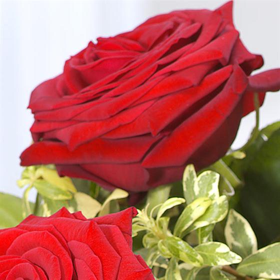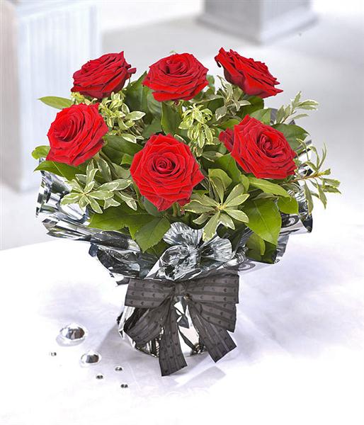 Simply lush gorgeous roses 'to love', an aqua pack of 6 perfect red roses surrounded by plump green foliage.