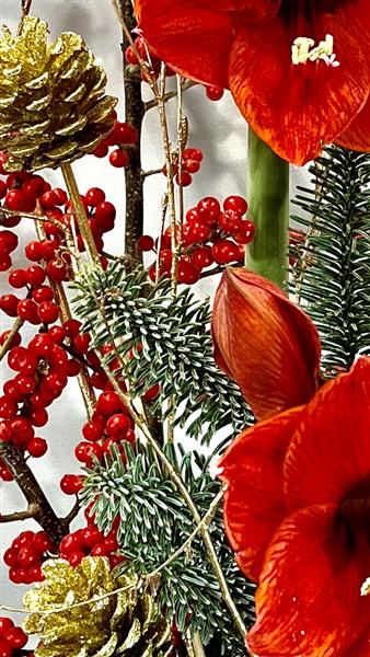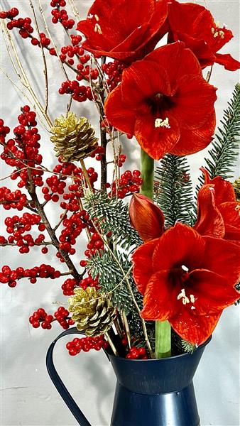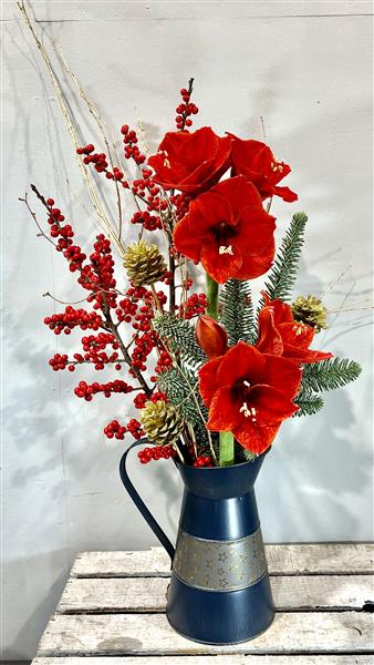 A festive jug filled with Christmas favourites amaryllis berries and sone lovely festive pine, with gold twigs and comes picking up the pretty gold stars on the container