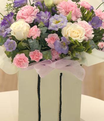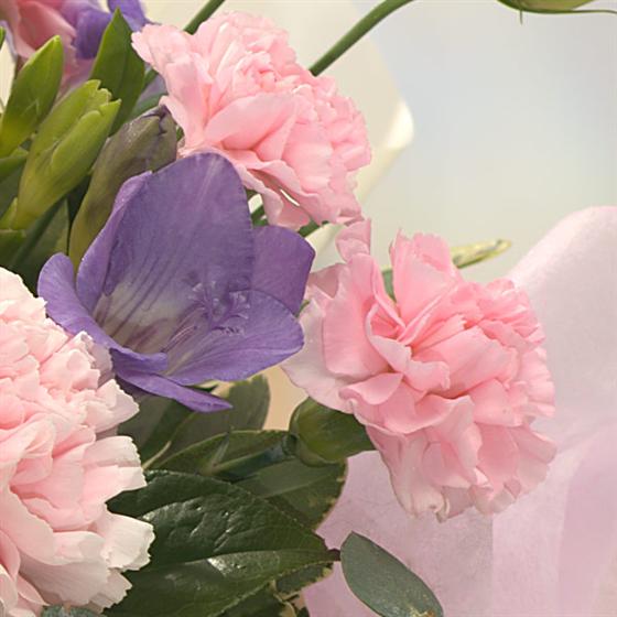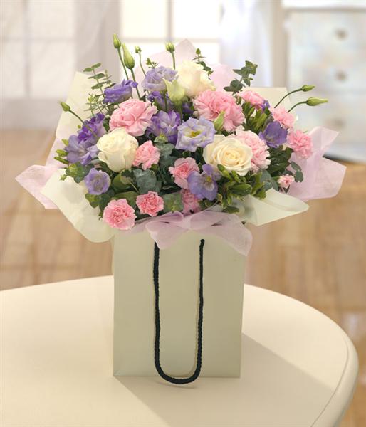 A beautiful selection of pink, cream and lavender Roses, Freesias and Carnations beautifully presented in a gift bag.