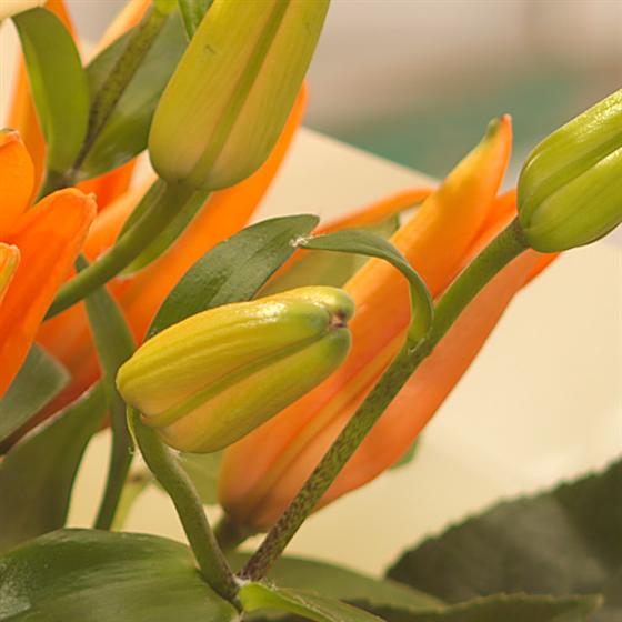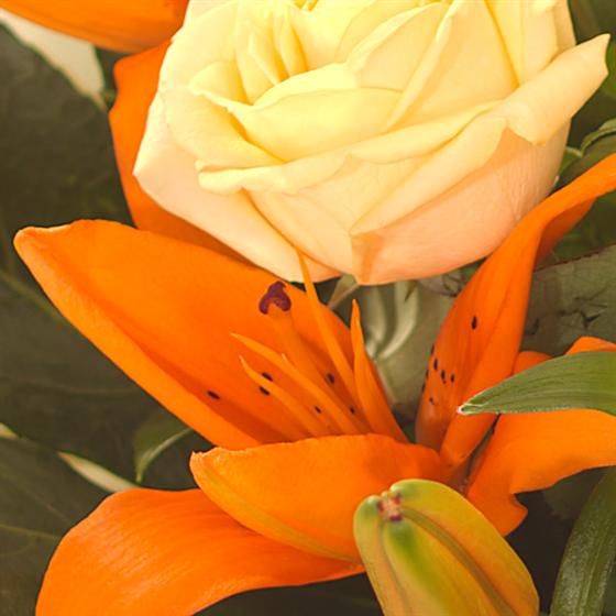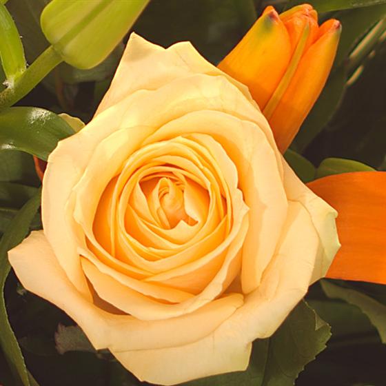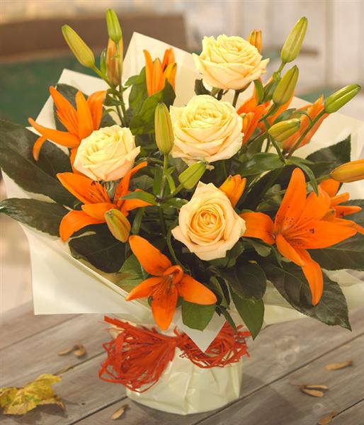 Warm orange Lilies and pretty peach Roses perfectly combined to form this gorgeous aqua packed flower arrangement.
