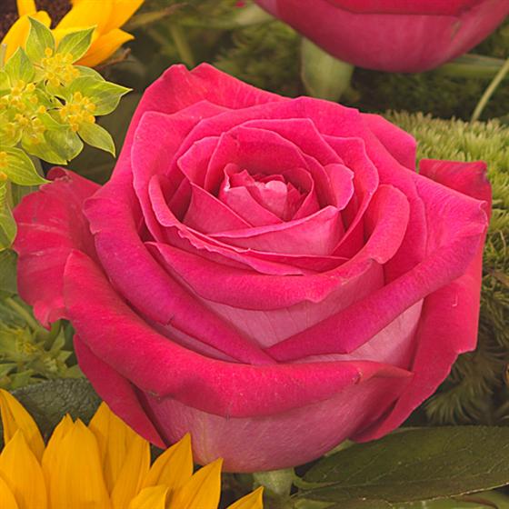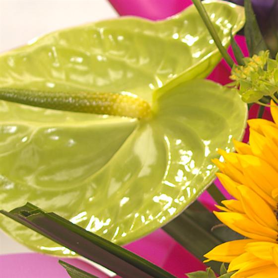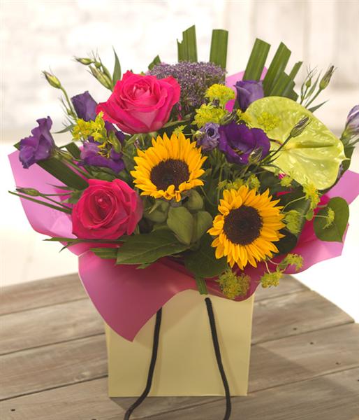 This bright and cheerful hand-tied is aqua packed for freshness. Scented Roses are accompanied by bright Sunflowers, vibrant Anthuriums and delicate Lisianthus.