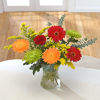 Glowing orange and red Gerbera and red Roses create a warm arrangement to brighten somebody's day.