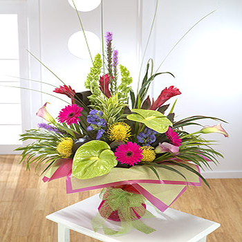 An elaborate hand tied aquapack design with tropical flowers stars Anthuriums, Gerberas and Calla Lilies and exquisite foliage.