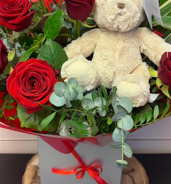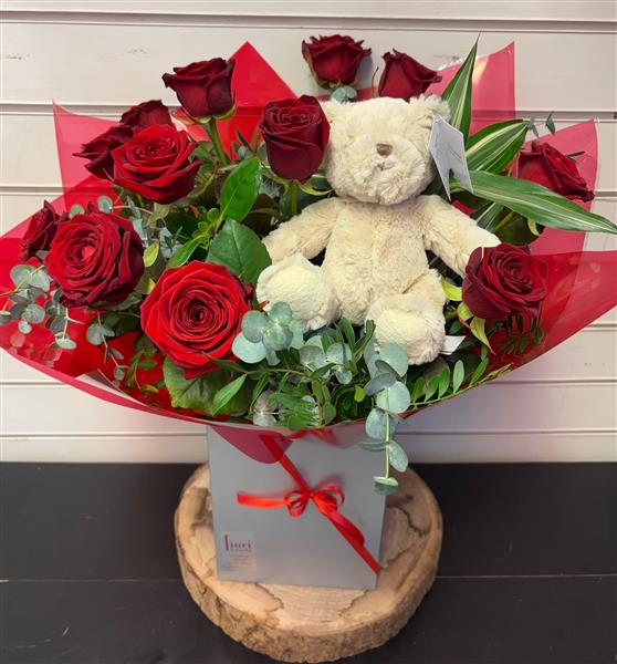 A dozen beautiful red Naomi rose’s beautifully gift wrapped and Rosie bear in the bouquet ti give a lasting sentiment