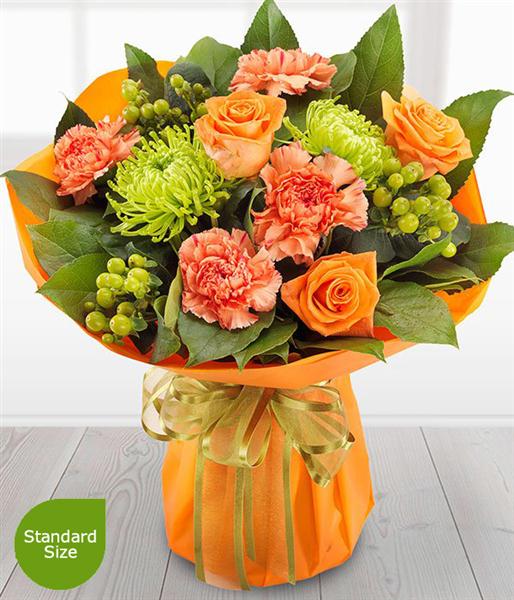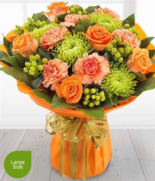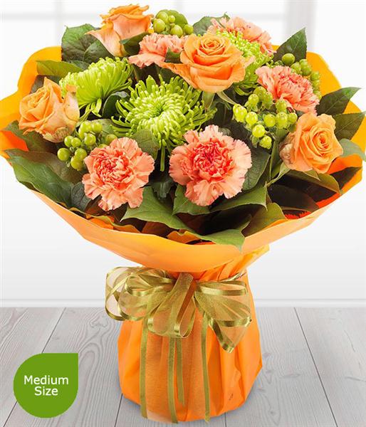 Includes Orange Roses, Green Chrysanthemums, Orange Carnations, Green Hypericum Berry, Aralia Leaf, Salal