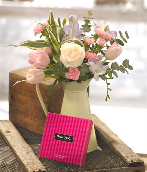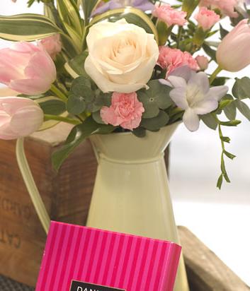 A jug full of delicate soft Spring flowers: Roses, Tulips and long lasting spray Carnations, includes 9 Danucci Milk Chocolates.