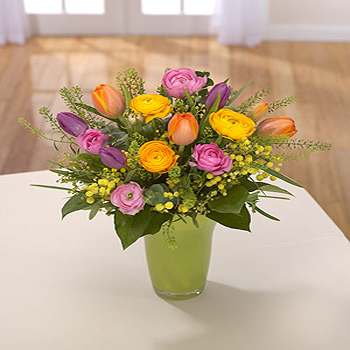 The essence of Spring - orange and mauve Tulips, pink and gold Ranunculus and yellow Mimosa star in this natural arrangement.