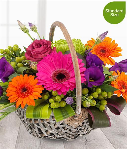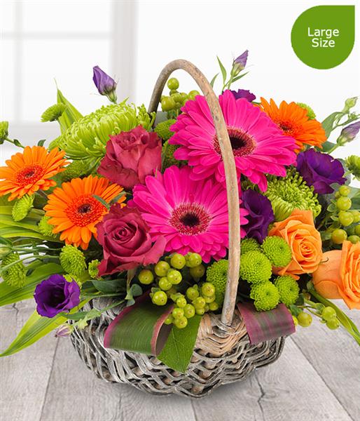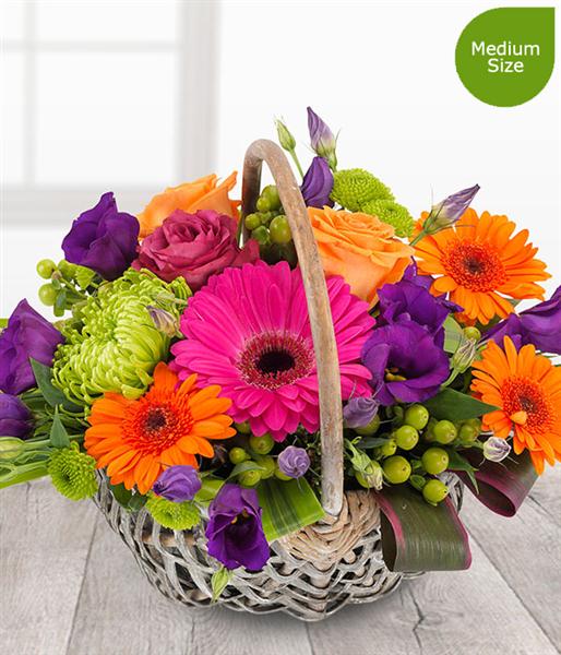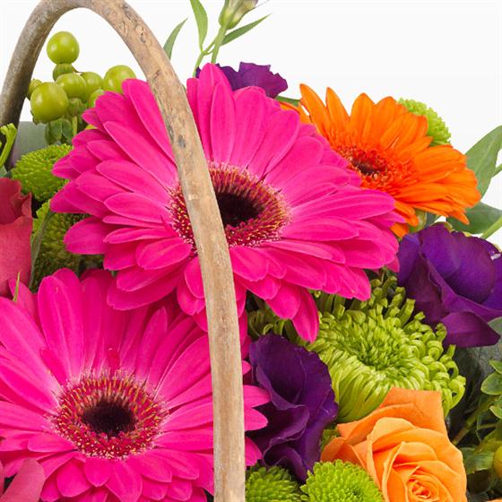 An orchestra of colour in one fabulous flower basket arrangement. Cerise Roses and Gerberas, orange Roses and Germini, purple Lisianthus married with Green Chrysanthemums.