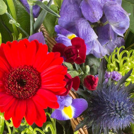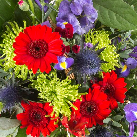 A classic basket and modern blooms fuse together to create a vibrant red, purple and lime display.