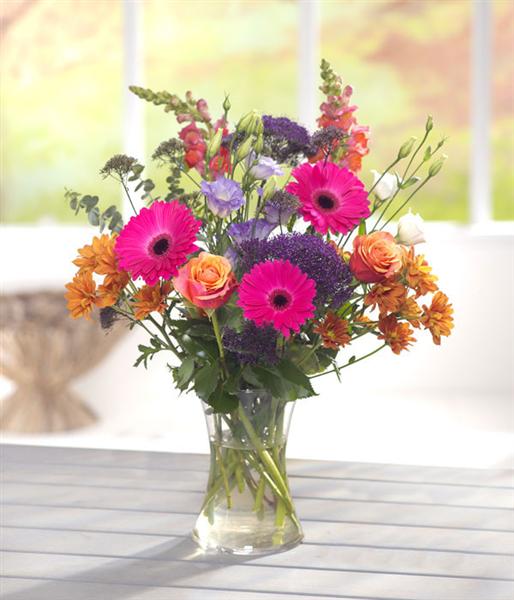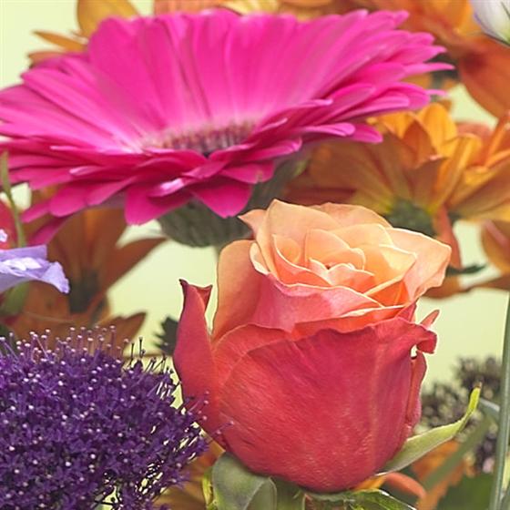 The dramatic cerise Gerberas offset against fiery Roses, Chyrsanthemums and purple Trachelium create this rich flower arrangement.