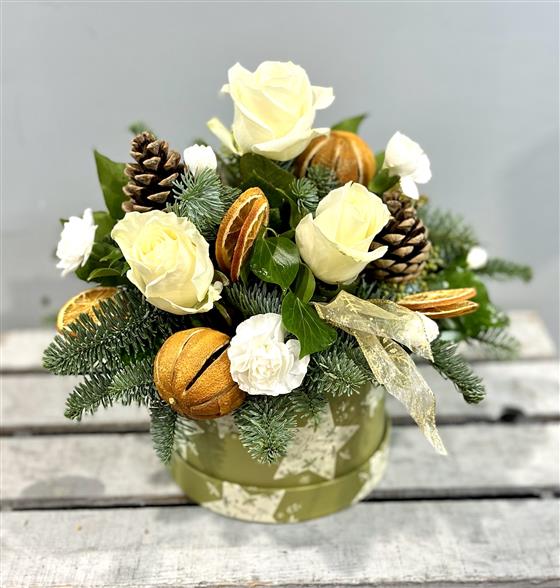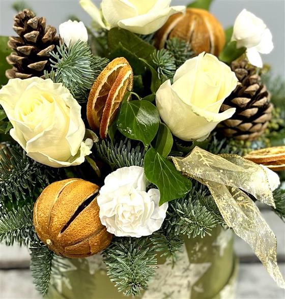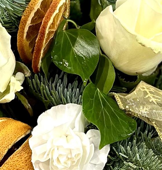 An all time favourite of roses, carnations and dried oranges and orange slices
