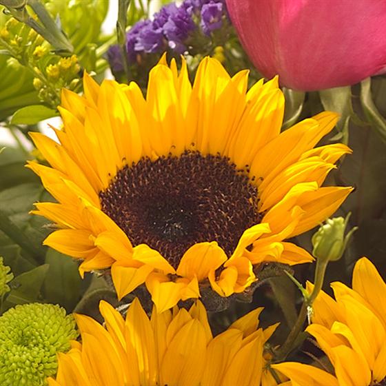 A colourful, sunshine basket arrangement containing bright Sunflowers and hot pink scented Roses. A simply stunning, fuss free flower arrangement. Just add water occasionally.