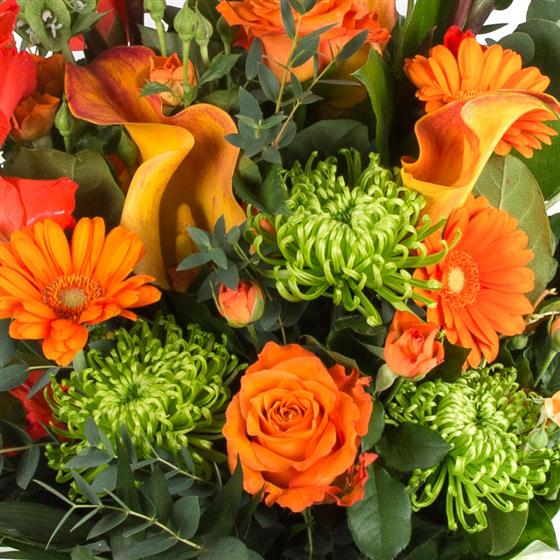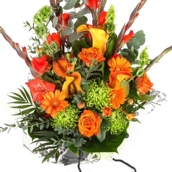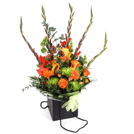 A lavish gift of exotic orange and lime blooms presented in a stylish gift bag.