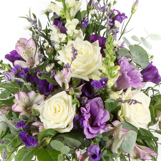 A sweet arrangement in shades of whites, creams, lilacs and purples including roses, september flower, lisianthus and alstromeria.