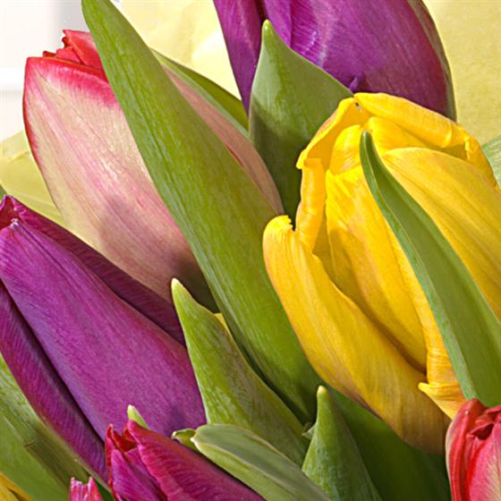 A very pretty and bright arrangement of mixed Tulips. An ideal spring in to summer bouquet.