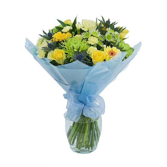 Perfection arrangement including Yellow Roses, Eryngium, Carnations, Anistasia green bloom, Chrysanthemums and Assorted foliage.