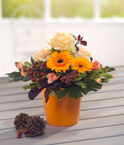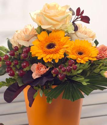 A zesty orange autumn container arrangement, packed with Germini, Roses and Carnations.