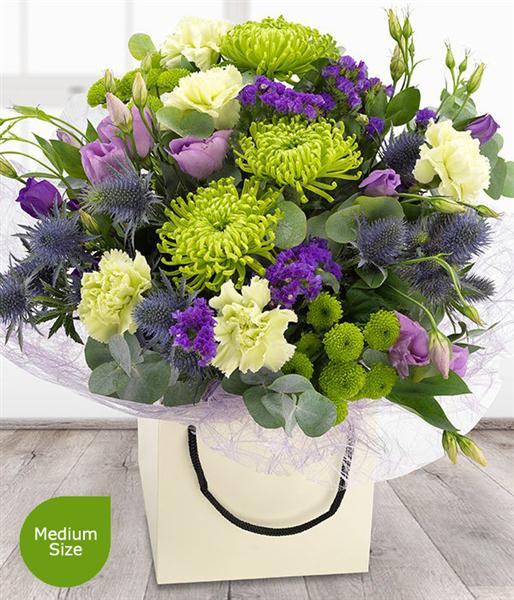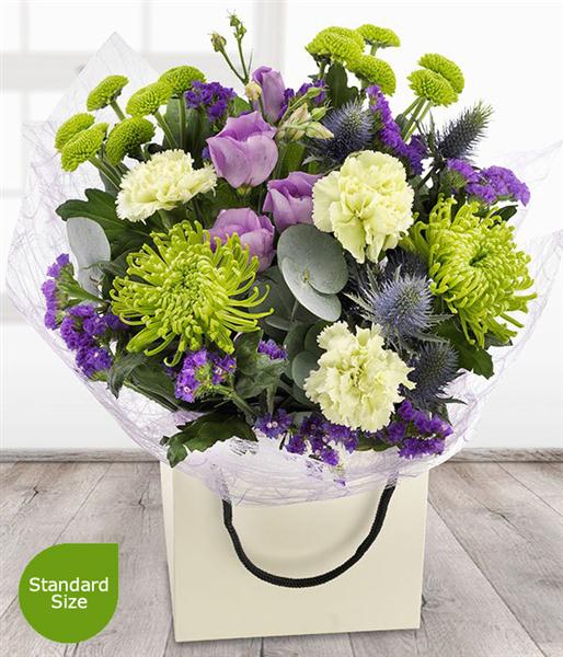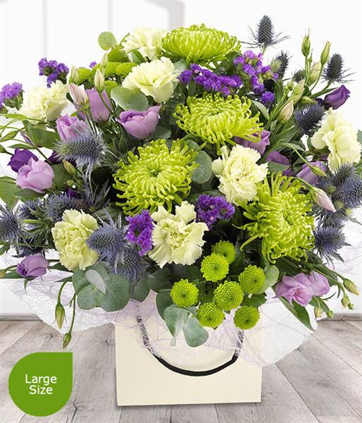 A cool, fresh, green and purple flower bouquet. Lilac Lisianthus and purple Statis have been cleverly combined with glorious green Chrysanthemums and Carnations to create this particularly unique arrangement.