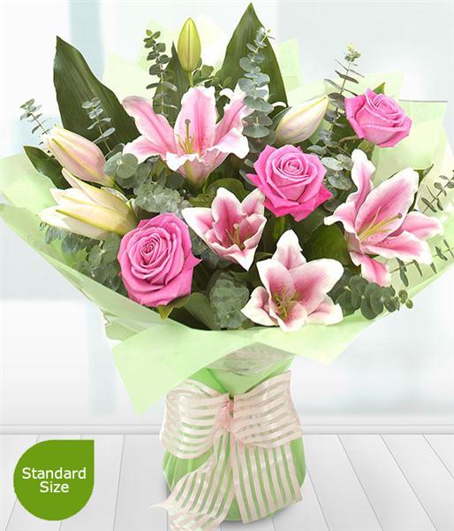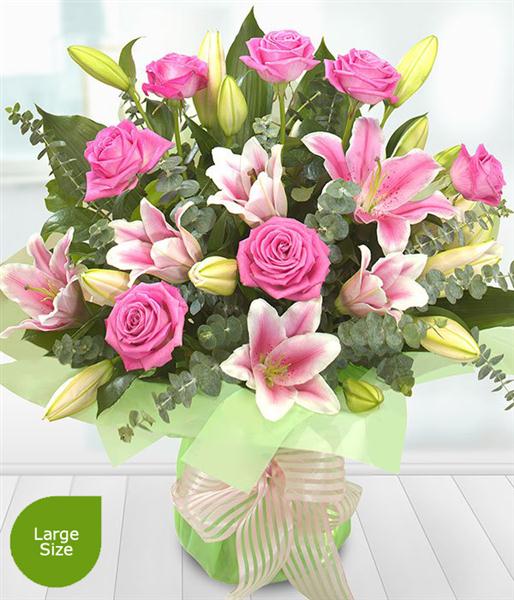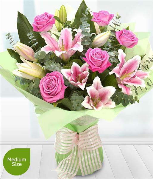 A hand-tied explosion of pink Roses and Lilies interwoven by Eucalyptus - a special design for any occasion.