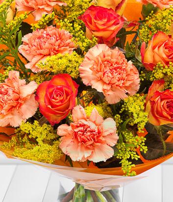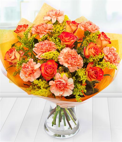 A delicious combination of pink and cream coloured Roses and orange Carnations nestled in a bed of Solidago.
