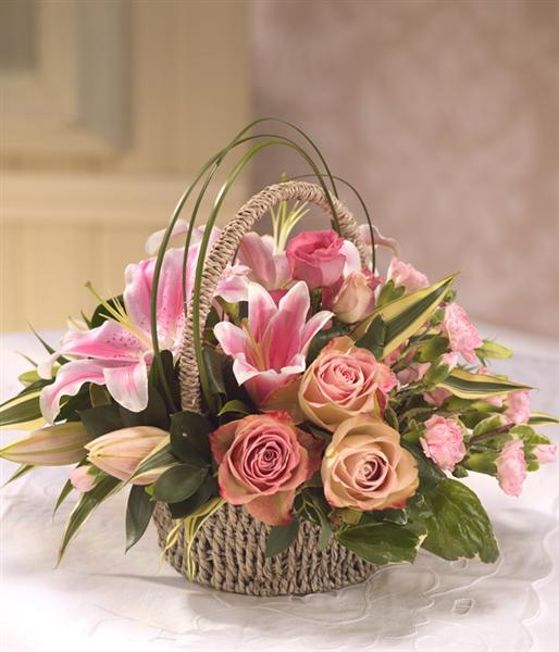 A classic Mother's Day favourite. This fragrant basket contains Lilies, Roses and spray Carnations.