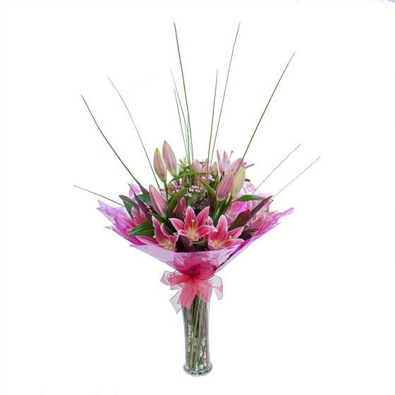 A handtied design consisting of Stargazer Lilies, Steel grass, Wax flower and Cordyline Red Edge.