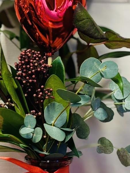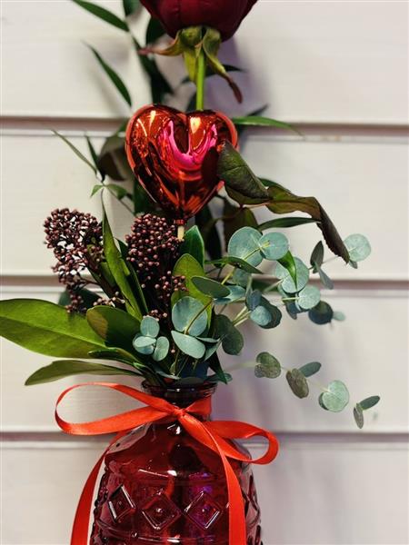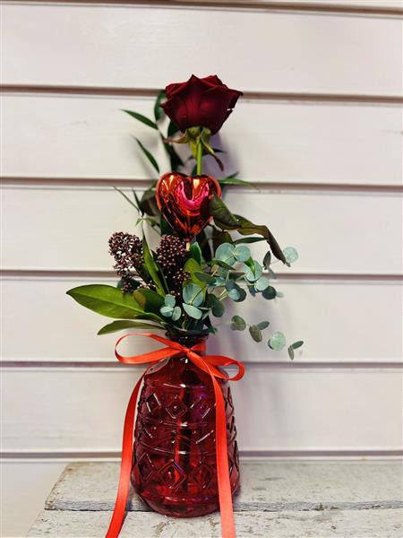 A single red Rose presented in a textured red vase with foliage's and a heart, simple elegant and perfect