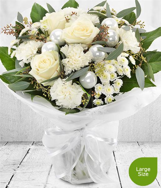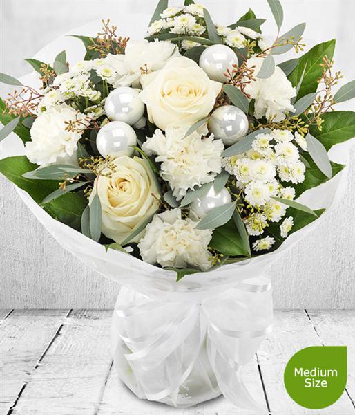 A divinely pure white Christmas Aqua-pack Bouquet featuring Roses, Chrysanthemum, Carnations and pretty white baubles.