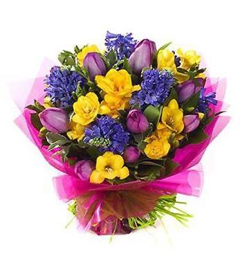 Bright and fresh Hand Tied posy design of Daffs, Tulips, Freesia, Hyacinths in beautiful spring colours