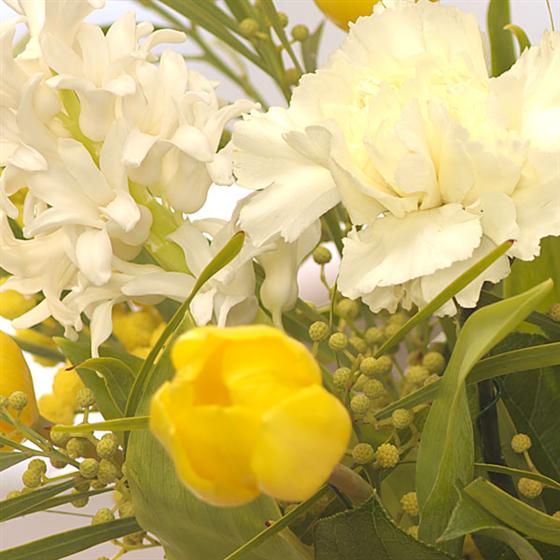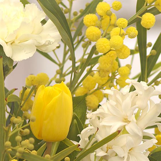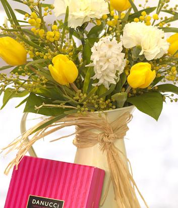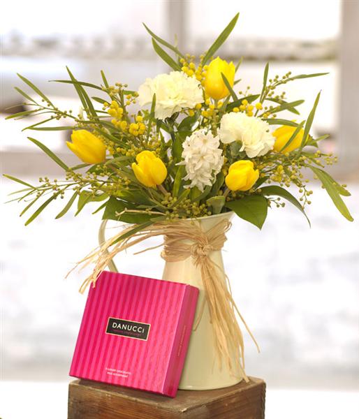 A fabulously fragrant cream jug of Spring flowers including long lasting Carnations, yellow Tulips, scented Hyacinth and Mimosa includes 9 Danucci Milk Chocolates.