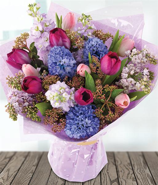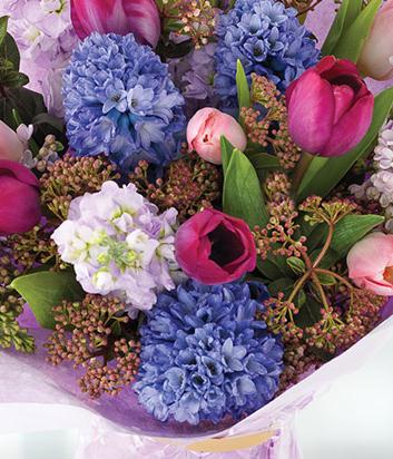 Make someone smile with this gorgeous aquapack of blue Hyacinth, pink and cerise Tulips and lavender Stock finished with Viburnum.