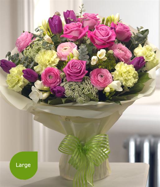 Delicately fragrant and stunning in design, this aqua pack bouquet is a spring fresh, sophisticated arrangement featuring Roses, Tulips, Carnations, Freesias and Ranunculas.