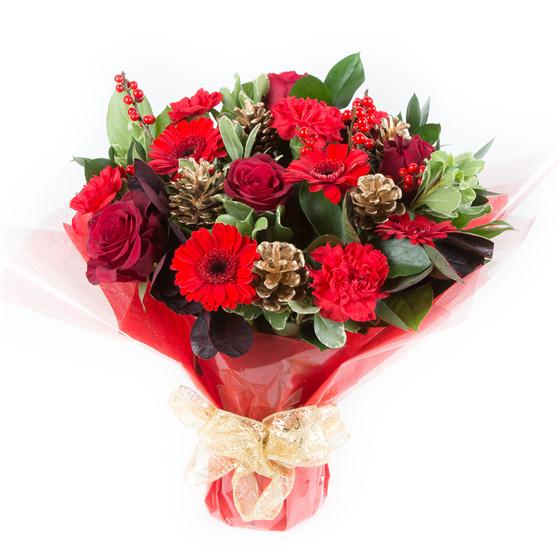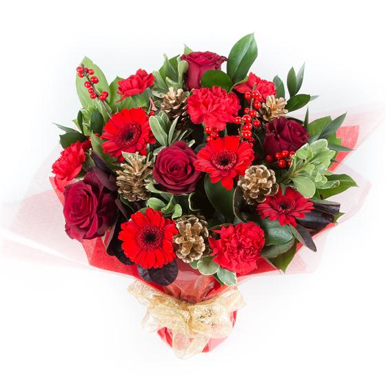 A striking all red hand-tied aqua bouquet of roses, gerberas, carnations and berries including golden cones.