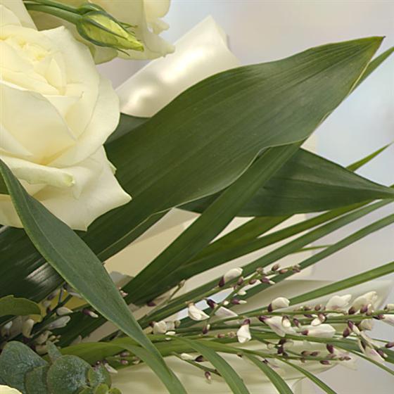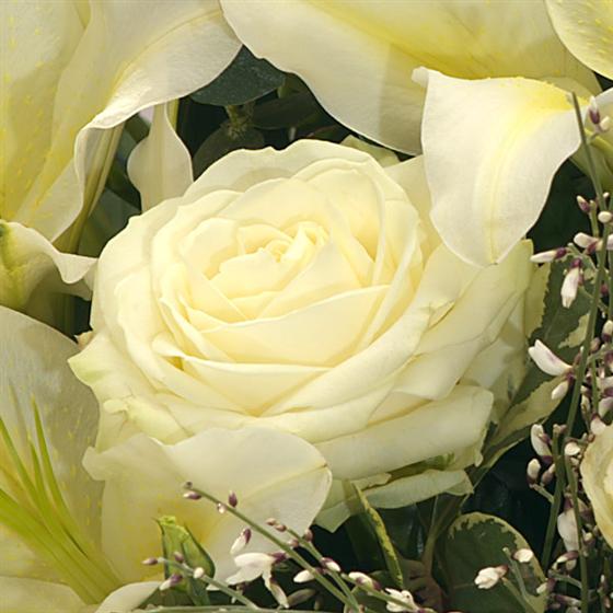 A selection of flowers featuring white Roses and fragrant Lilies delivered in a gift bag.
