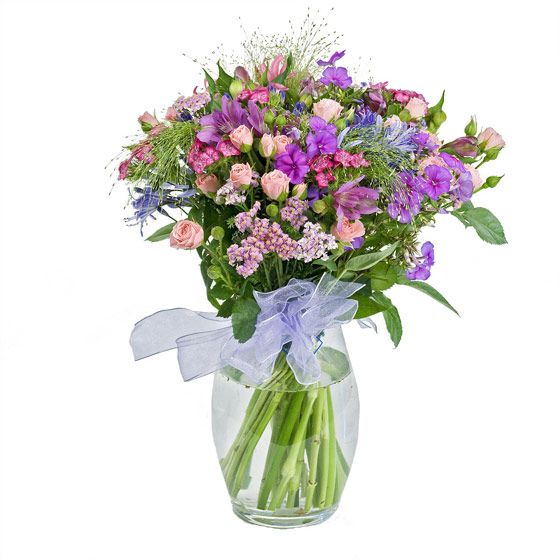 A delicate hantdied arrangement consisting of Sweet William (when available), Nerine, Spray Roses, Alstromeria, Agapanthus, Phlox, Freesia and Assorted foliage.