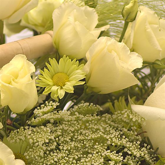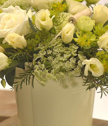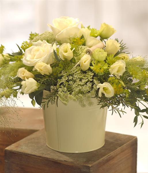 A beautifully cool summer colour combination of Roses, Lisianthus, Chrysanthemums and foliage, presented in a lovely cream flower bucket.