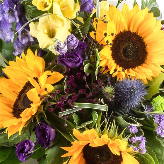 A magnificent arrangement of bright yellow sunflowers, gladioli, aconitum and lime green chrysanthemums.