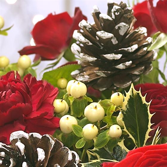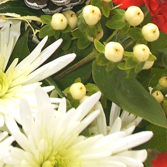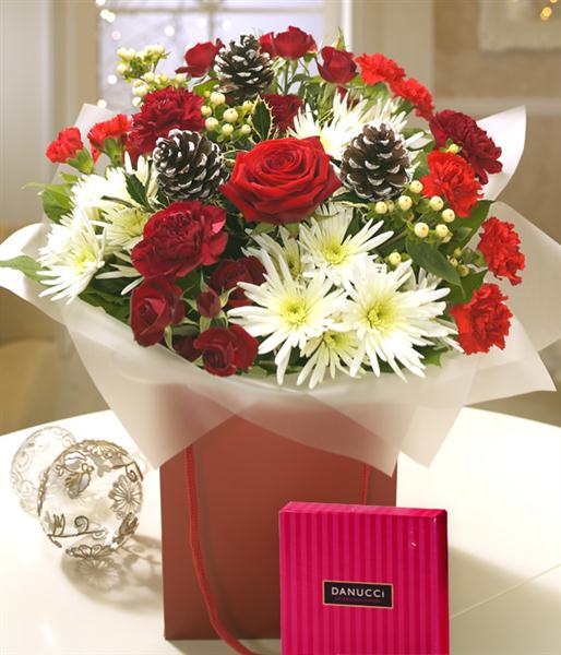 An ideal Christmas flower gift - rich red Roses married with deep red velvety Carnations sit perfectly alongside the creamy white flourishes of spray Chrysanthemums. White frosted Pine Cones and a delicious box of 9 Danucci Milk Chocolates completes the gift.