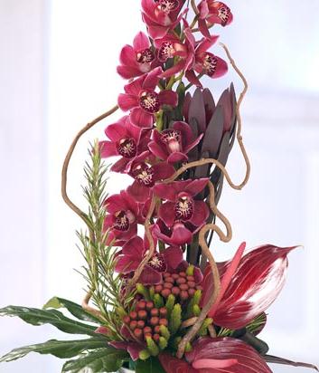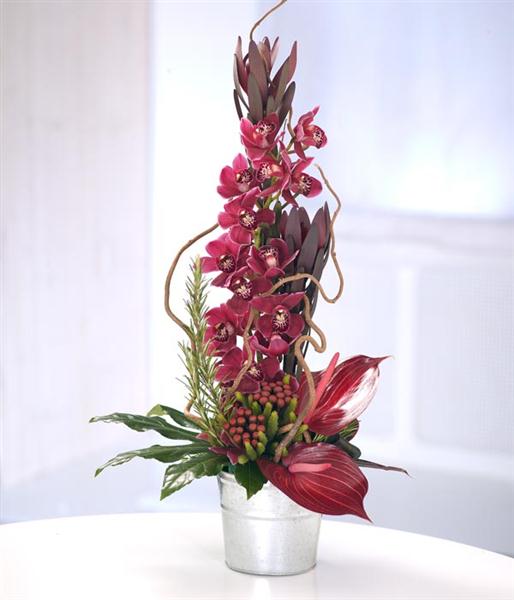 An exotic modern tall container arrangement featuring red Cymbidium Orchids and red Anthurium. Flowers are arranged in floral foam for long lasting freshness and easy display.