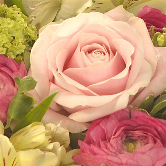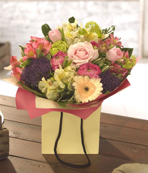 A delightful vintage hand-tied featuring Roses, Germini, Alstroemeria, Ranunculus, Trachelium and Viburnum Opulus. Designed to go directly in to a vase.