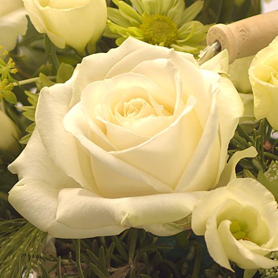 A beautifully cool colour combination of Roses, Lisianthus, Chrysanthemums and foliage, presented in a lovely cream flower bucket.