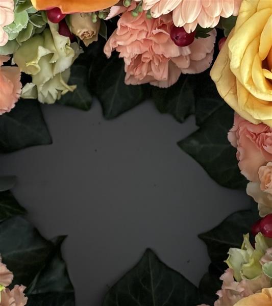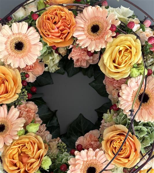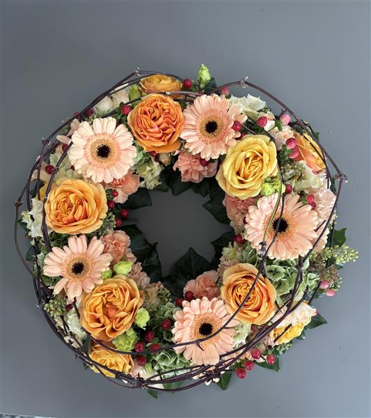 A gorgeous natural wreath of peachy orange shades incorporating gerbera, roses, Lizzieanthus and textured foliages