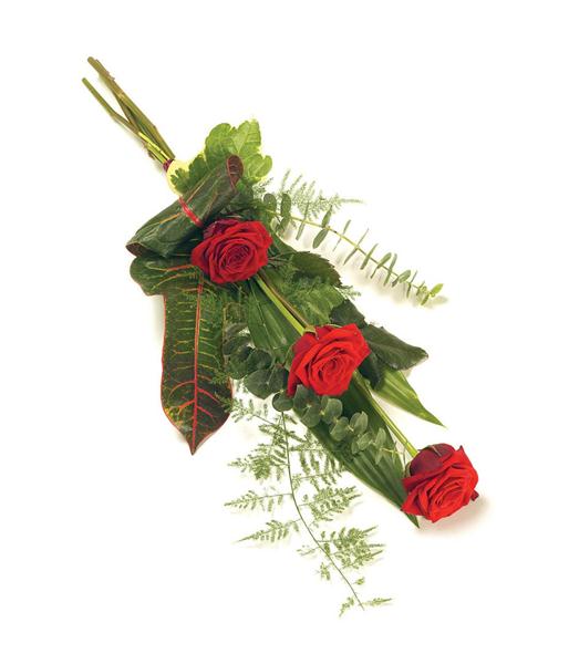 A classic and elegant sheaf of 3 roses and complementary foliage tied with a ribbon. Size: 61cm (24").