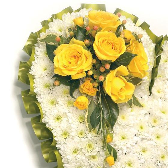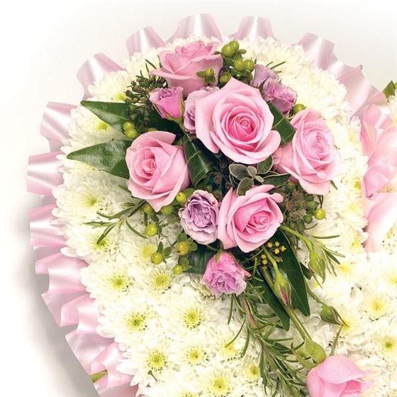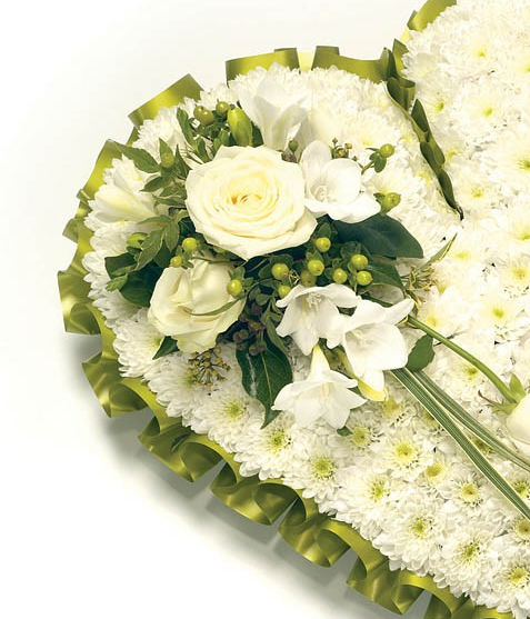 Classic red and white Chrysanthemum based heart shaped tribute with Roses, Freesia & Hypericum and complementary foliage edge.