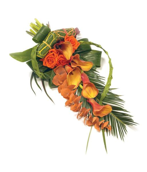 Calla lily and rose sheaf in shades of orange.