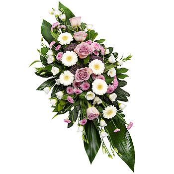 A double ended spray of lilac Roses, white Germini, Lisianthus, purple Trachelium and lavender Chrysanthemums.