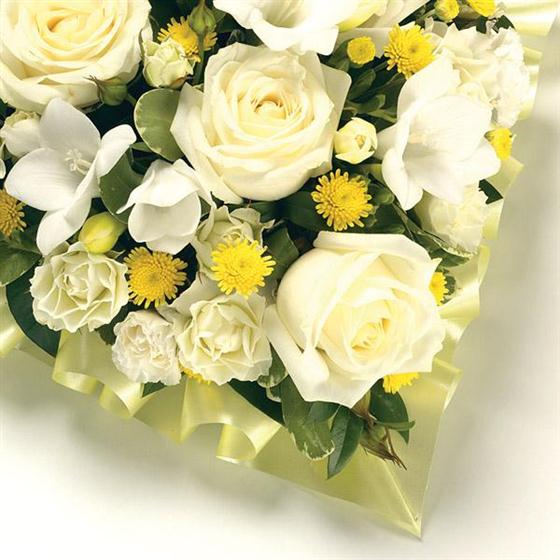 A beautiful pink & white coloured heart shaped tribute, featuring Roses, Eustoma, Chrysanthemums, fragranced Freesias and complementary foliage with a ribbon edge. Size: Height - 33cm (13") Length - 33cm (13").