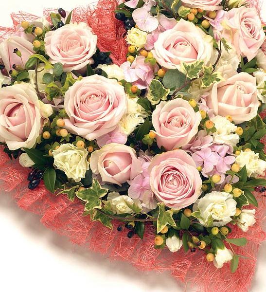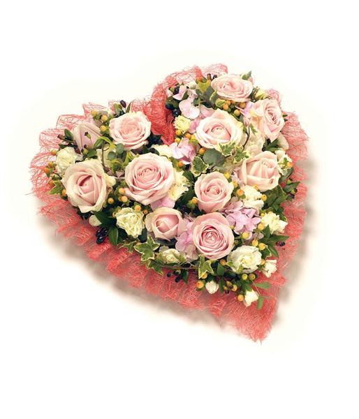 A beautiful Pink & Peach coloured heart shaped tribute, featuring Roses, Eustoma, Chrysanthemums, fragranced Freesias and complementary foliage with a designed edge.
